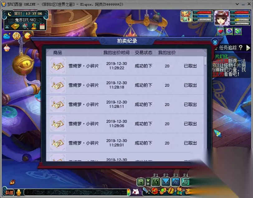 l 拍卖结束后,前往NPC可以查看各拍卖物品的最终成交价。 是的你们没有看错,小肥皂在关注别人的物品的时候,偷偷摸摸的自己竞拍了一个瑰梦涟~哦也~成功~