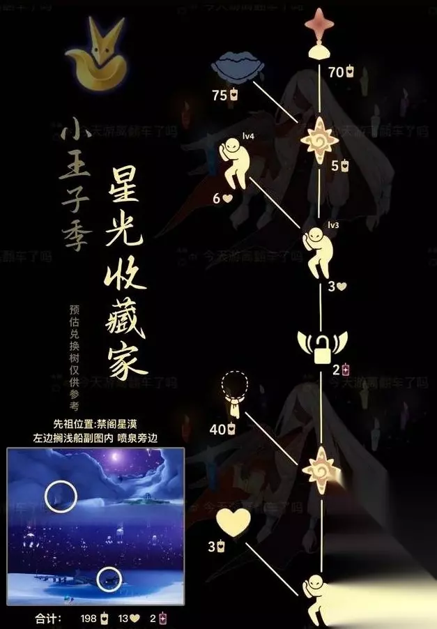 光遇星光收藏家先祖兑换表2023 1、星光收藏家先祖的复刻列表如下图所示:星星灯70蜡烛,斗篷75蜡烛,需要解锁下方的节点后才能购买。领巾饰品40根蜡烛。兑换所有物品需要198蜡烛。