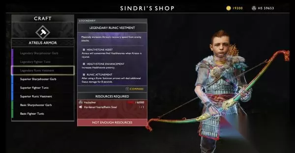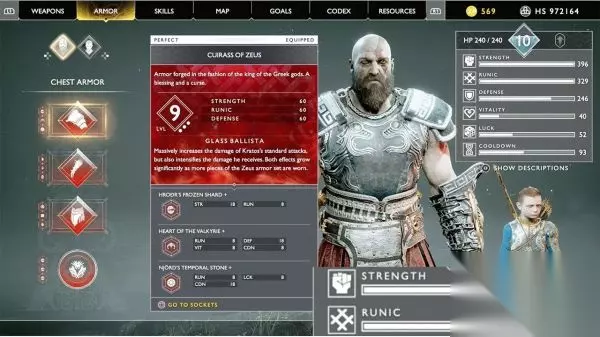 能力: 【治疗药石辅助】:奎托斯受伤时,阿特柔斯有时会找到治疗药石 【治疗药石增强】:提升治疗药石的威力。 【卢恩符文协调】:使用卢恩符文召唤后,箭矢可以造成额外异常状态伤害,持续8秒 获得方法: 在布罗克或辛德里的商店中制作。所需材料为60000银片和1个斯瓦塔尔夫海姆硬钢 二周目 奎托斯-宙斯护甲 宙斯护甲是游戏中属性最好的护甲,而且只能在二周目中获取。每件装备都有3个咒术插槽