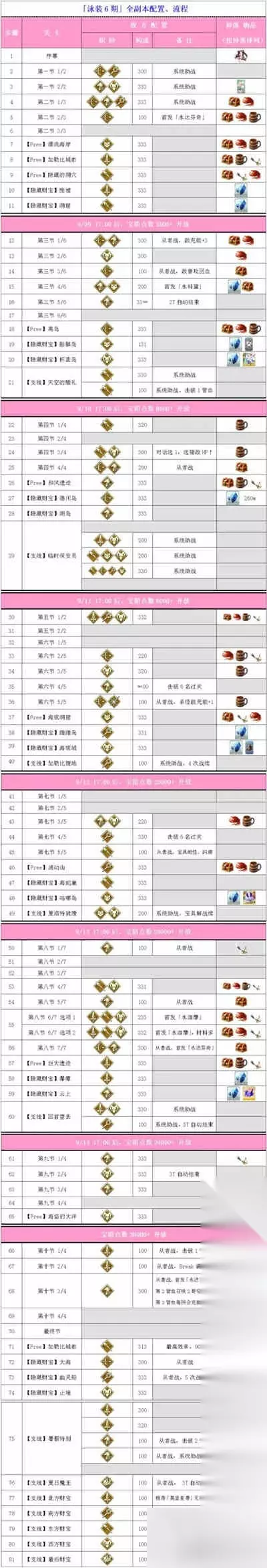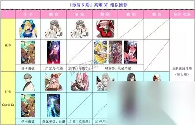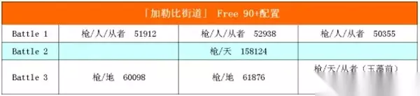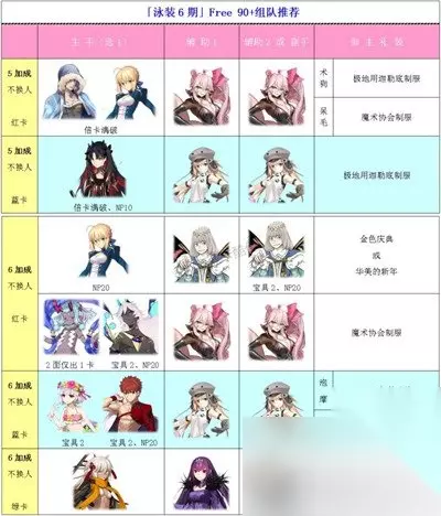 在主线和支线副本中,有大量的关卡等待挑战。你只能使用系统提供的阵容,这在界面上以"系统助战"标识。在配置中,数字"330"表示第一、二面各有三个敌人,而没有第三面,以此类推。部分关卡的战前对话可能会微妙地影响难度和掉落物,但影响较小,可以选择忽视。在掉落加成中,除海盗宝箱外,如果只有两种掉落物,排在前面的是主要掉落物。如果有三种,那么三种掉落物的概率是均等的。 此外,关卡的难度总体上偏低,有些关卡甚至会自动结束。如果你遇到了难题或者卡关,建议使用令咒来解决。三周的时间应该足够你恢复令咒。 5.Free 90+刷本推荐 配置: