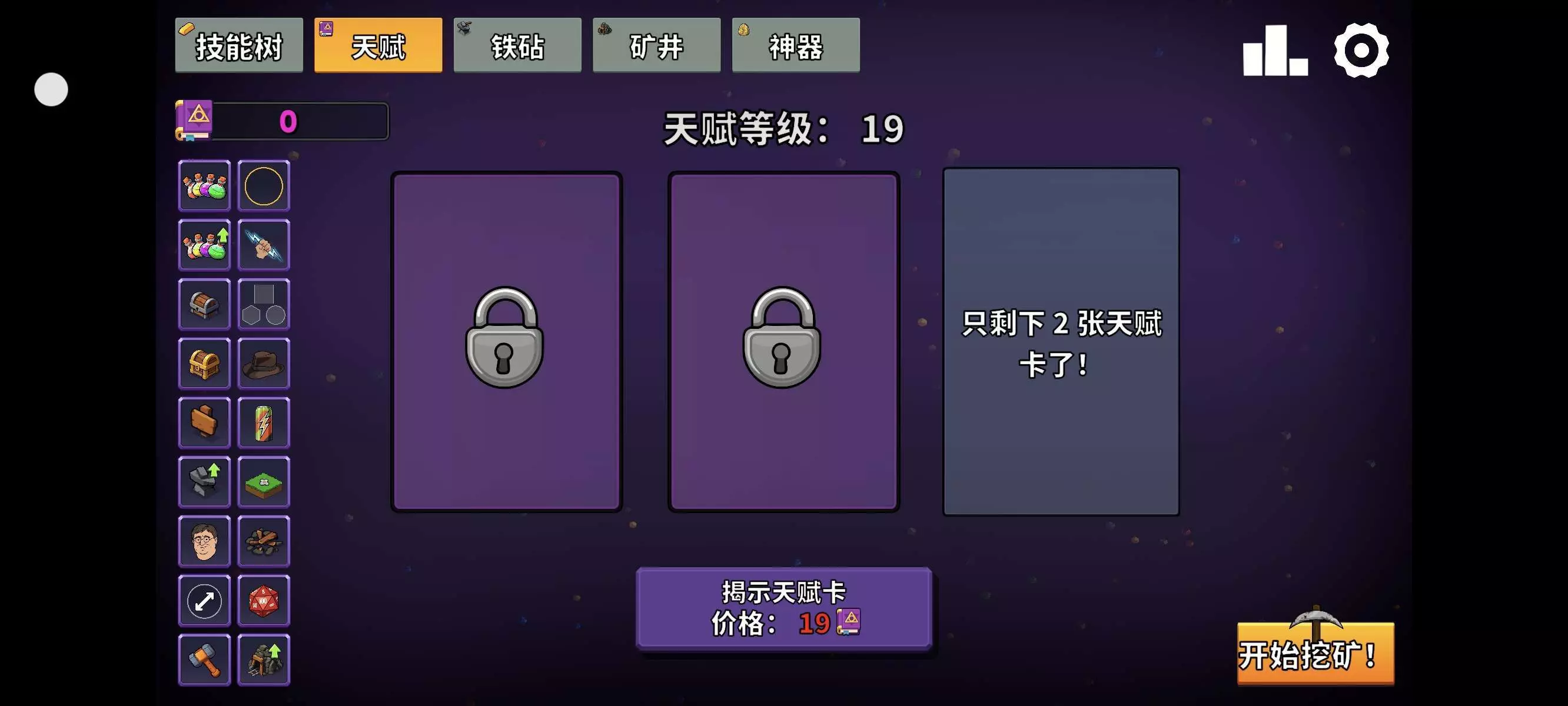 运气还好,20张天赋牌有4张没什么用,两个矿井的,两个找神器的,前期天赋没什么用,还容易降低效率,除了加范围,变形,金框这些后期有点用