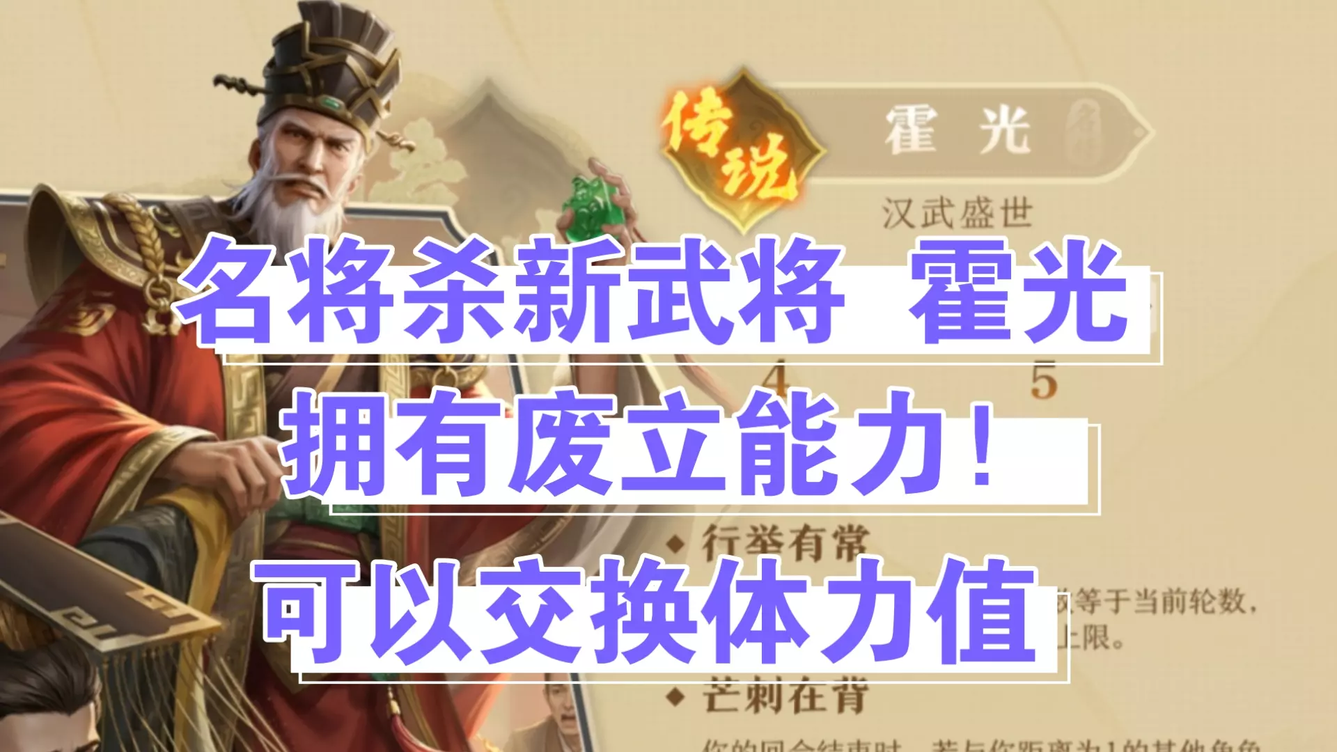 玩家表示要连夜上大将军段位更换boss血量,同时展示了游戏中的传说武将霍光,该武将属于汉武盛世系列,拥有行举有常、芒刺在背、擅专废立三个技能,体力上限4,手牌上限5。