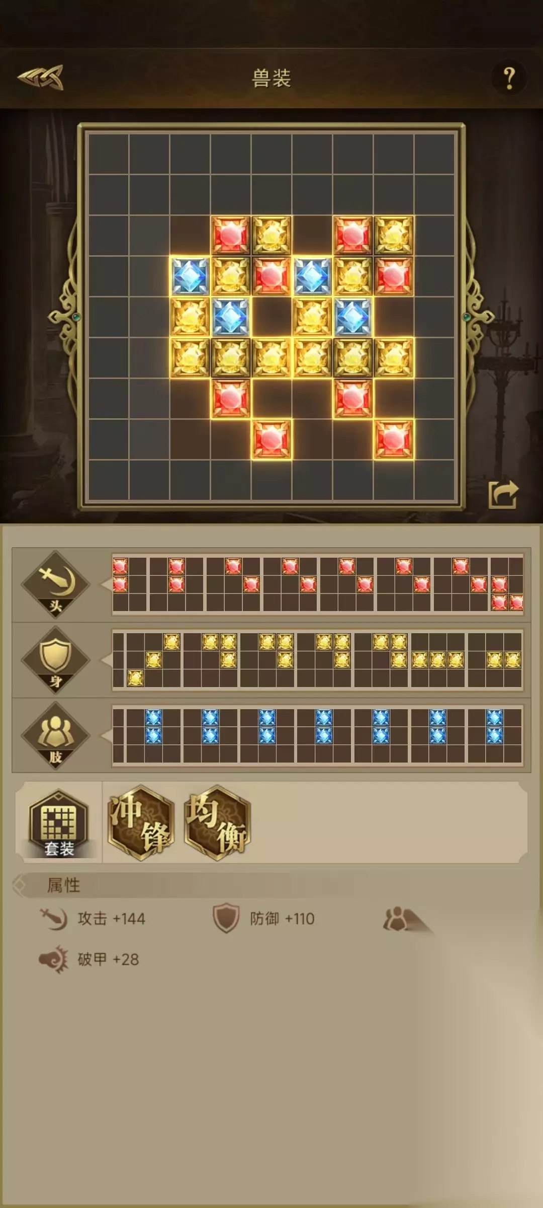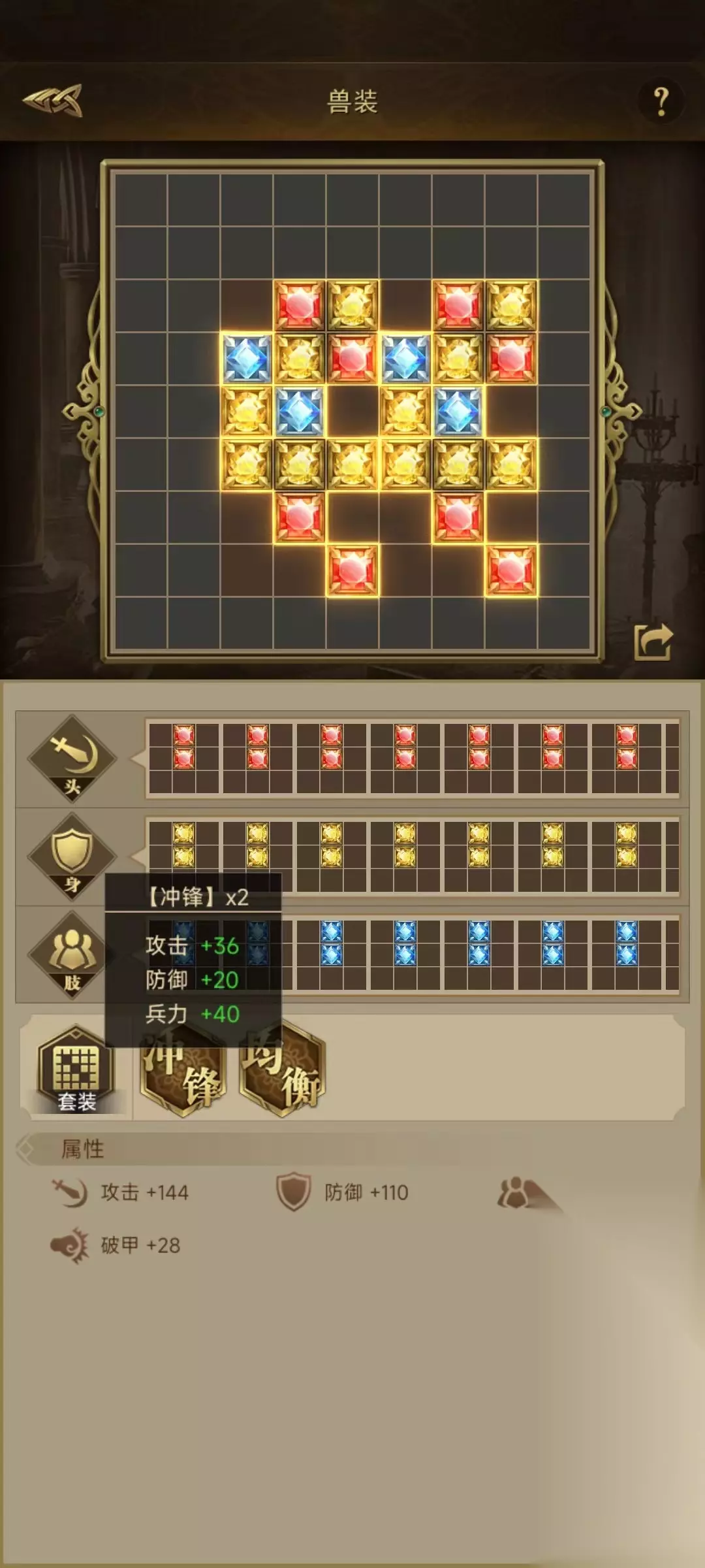 帝国战纪【攻略研究所】战兽套装-组件摆放共用如下: Hello,各位领主大大好! 今天给大家分享 由【紫菜】投稿的 【战兽套装-组件摆放共用】 希望能够帮到各位领主大大~ 小伙伴们的套装现在都9级以上,探险任务开始做高级些的套装,嬗变组合做10天也可能出不了一套。套装中有许多组合可以共用,是摆放时的共用,不是探险时的共用。可以解决组件不够用的问题。 那些可以共用呢,冲锋套装,均衡套装。 摆放时可以共用蓝色组件。也就时说只要1个蓝色部件,可以用在冲锋及均衡2个套装的组合摆放上。也可以共用红色部件,探险时红色黄色组件容易出现,蓝色组件不容易出现,建议共用蓝色组件。使用共用摆放可以更少空间放置更多套装组合,增加的战力也会更多。 双均衡套装攻击84 防御66 兵力104 破甲28。 如果不使用共用摆法,只有填补空白的方式。使用共用摆法。 双均衡及双冲锋 攻击144 防御110 兵力144