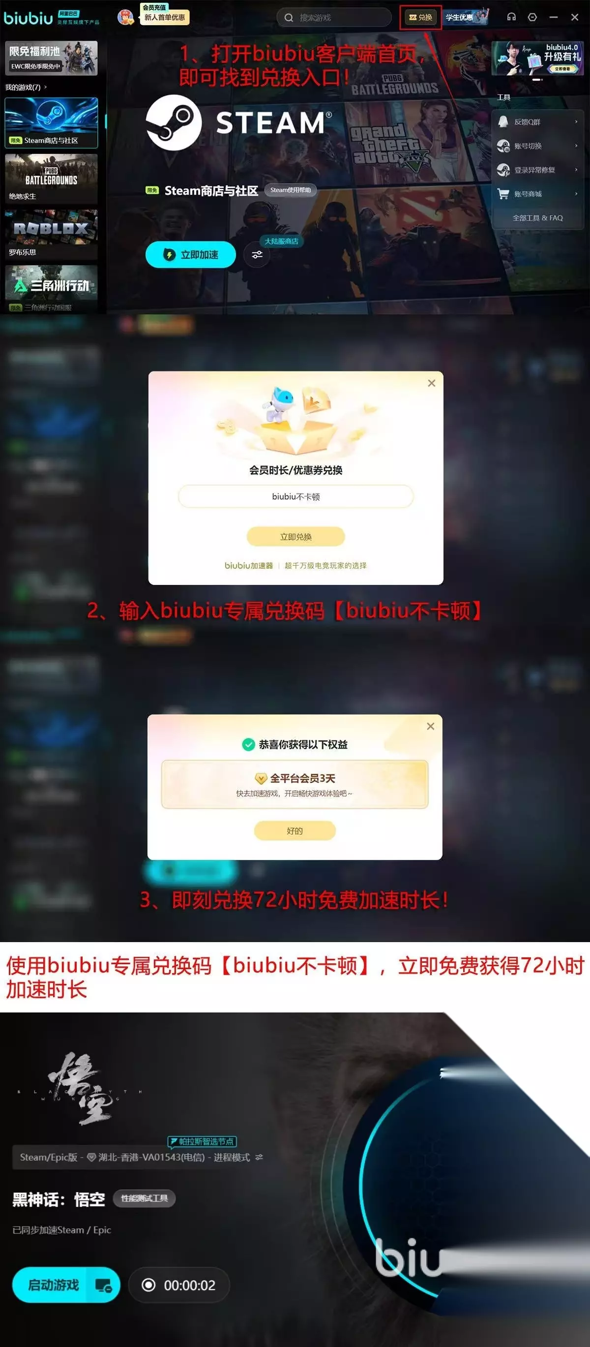 当然肯定也有小伙伴有使用价格方面的困扰,为此biubiu也是贴心准备了福利,让玩家们能提前免费享受服务,尤其是新人注册,直接享用24小时加速机会,还可通过“biubiu不卡顿”的兑换口令,拿到另外72h的VIP加速通道,2项福利并不是独立的,可叠加使用,也就是4天免费时长。