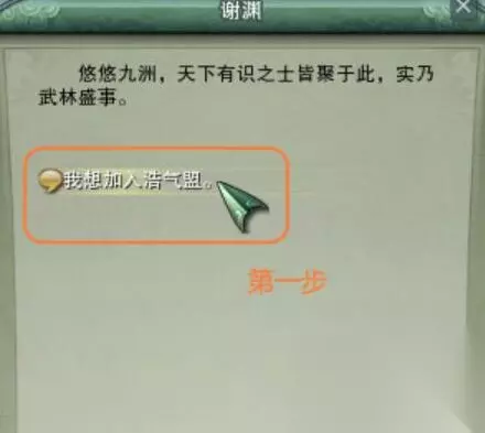 7、再找到谢渊后,右键点击谢渊与其对话,加入浩气盟;