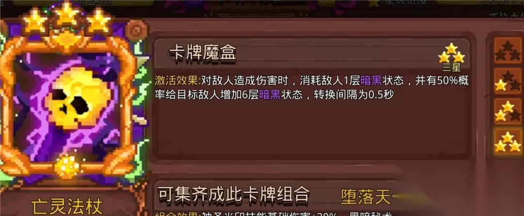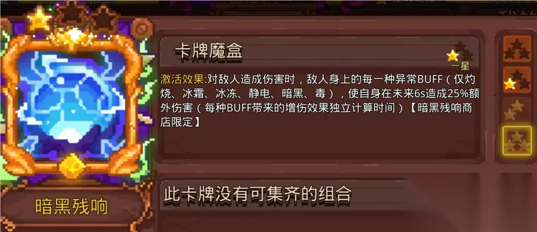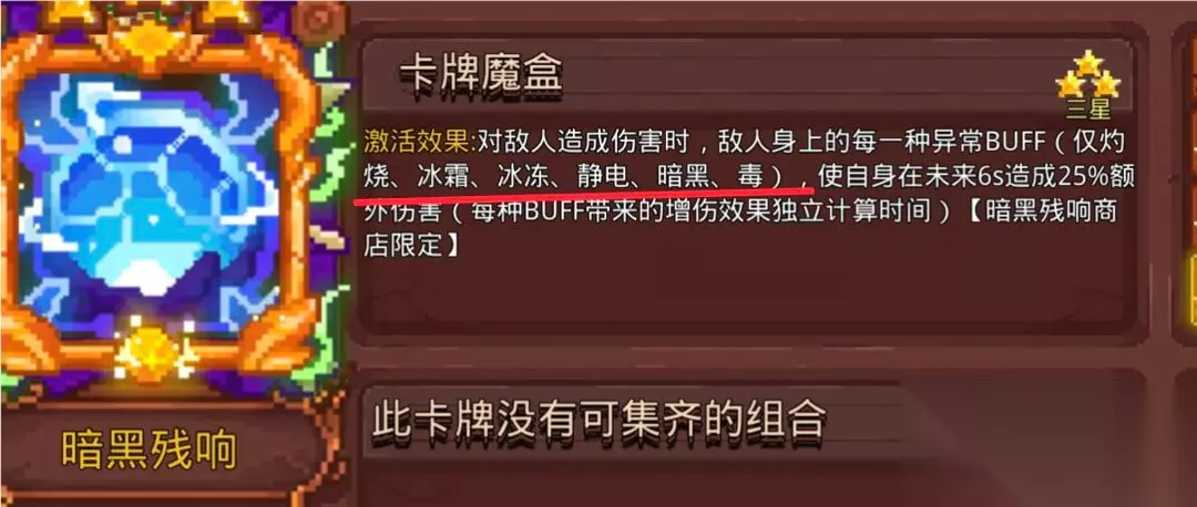 会有人在符牌组中带暗黑法典和融炎之翼,这是杜内老玩家为了加强瞬间爆发伤害用的,原理是使用技能触发法典的攻击和快速上黑暗转化成黑洞,使用技能触发翅膀攻击效果瞬间叠灼烧转化火融卡的地火。并不推荐萌新弄这两张卡。 15.暗黑残响