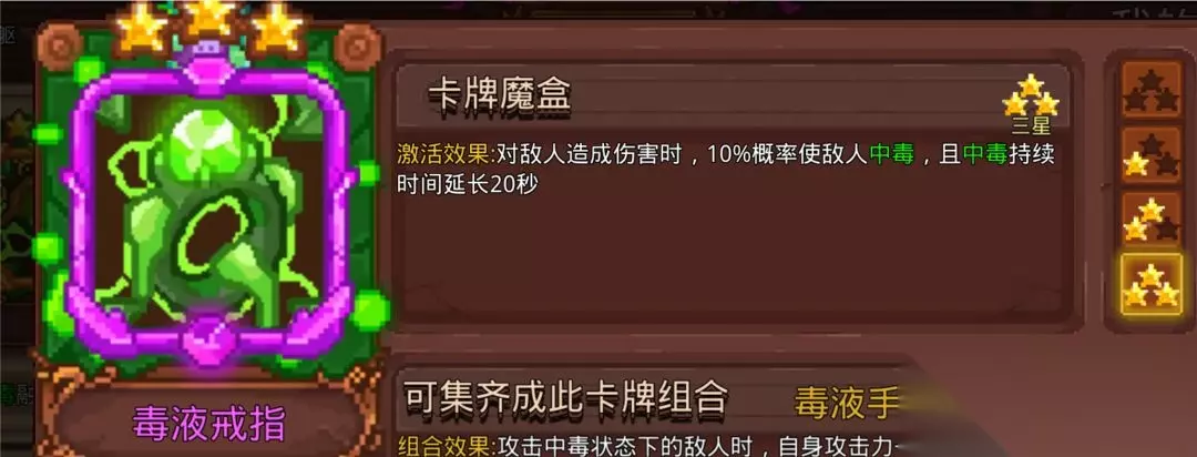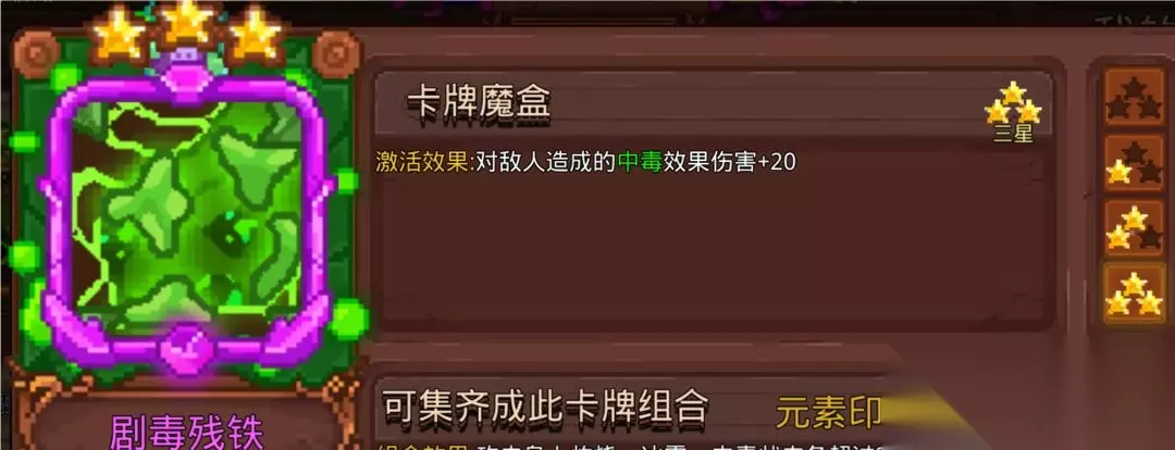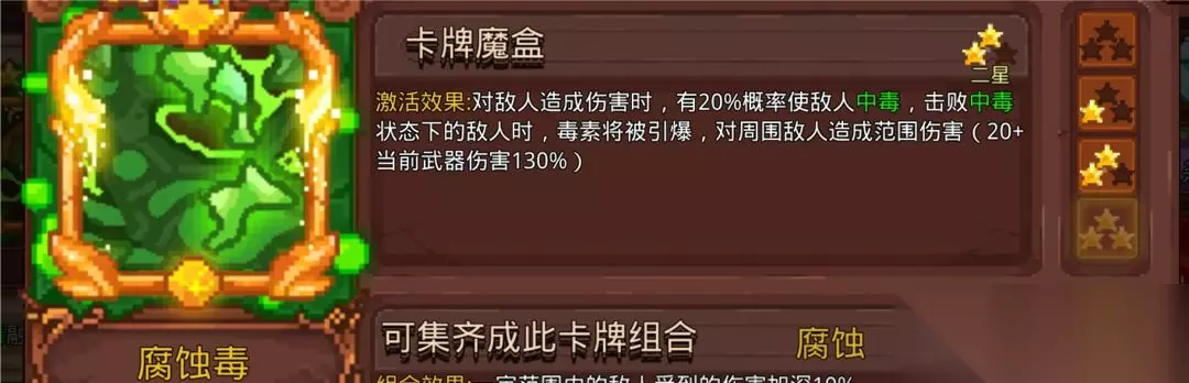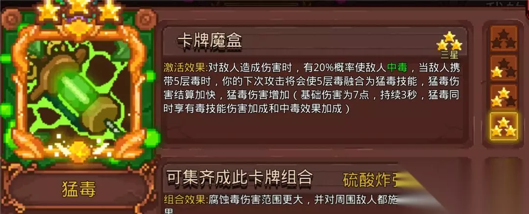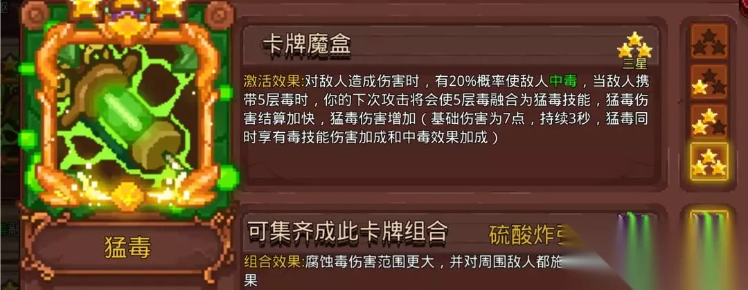 常用的是猛毒、腐蚀毒、毒残铁、毒戒指这4张毒卡搭配其他系的触发卡。我知道会有人说腐蚀毒没用,但是中毒概率摆在那里。因为现在秒老乌很快,需不需要带毒戒指延长猛毒时间因人而异。毒系的卡都是相辅相成,不建议单张使用。当然符也可以搭配整个毒体系使用,可能有人会说,毒和符不匹配,说符要拿高攻击力的武器搭配能造成武器百分百伤害的卡,毒系要搭配高攻击频率。你们如果认真算过符的攻击频率就了解为什么符可以搭配整个毒体系,太虚符和雷符每1.5秒3张符,冰符和火符每2秒3张符,悟道自带太虚符,能让全部符攻击时额外造成一次80%武器攻击力的范围伤害,神通大成组合能使所有飞出的符返回角色身上。算成平均每秒产生的符,悟道自带的太虚符每秒2张,雷符2张,冰符1.5张,火符1.5张。(2+2+1.5+1.5)=平均每秒产生7张符(如果带上太虚决卡是9张)。 7*2(悟道范围攻击)*2(神通大成组合飞回效果,一般与Boss站重叠能吃到全部返回符)=每秒28次攻击(带太虚决是36次攻击),黑洞提供的频率也不是盖的,唯一的遗憾是毒系几乎没有范围伤害,需要启动速度,清小怪的效率比杂符差一些。毒系的主场还是在高攻速的黑武毒,启动够快。因为需要多卡点出效果才好,要求星级,不够灵活,目前版本不推荐特意抽取。 6.太虚决