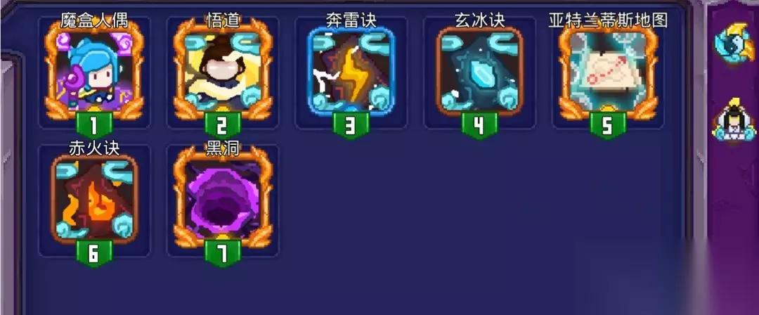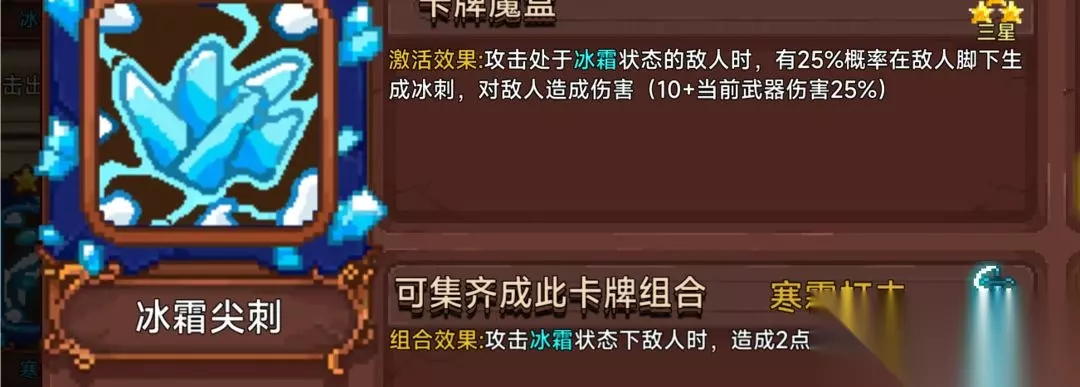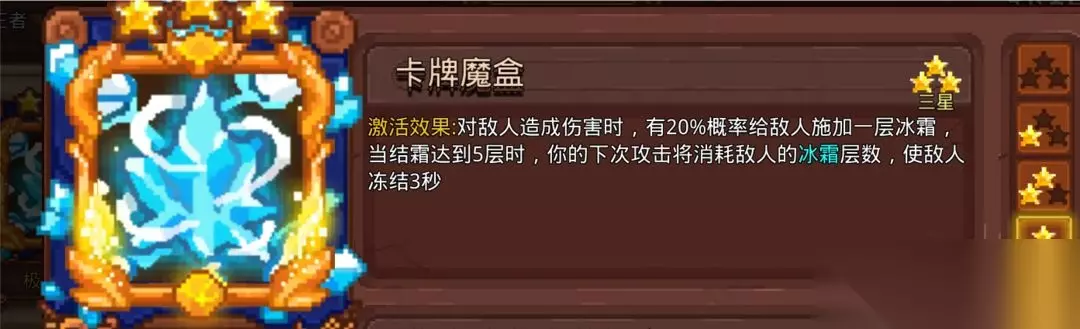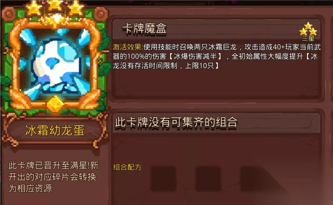 搭配黑洞使用,不稳定的提供暗黑层数。一般放在牌组后面点出,因为给小怪上一层暗黑要是法杖吃掉了没有转换成更多暗黑,会有点影响刷图效率,打Boss是很好用的,预期是一秒提供4层暗黑,那就是4个黑洞。攻击频率高到黑洞转换不过来(0.1秒转化一层变为黑洞)还能叠起来暗黑层数的时候可以不带。 10.冰霜幼龙蛋