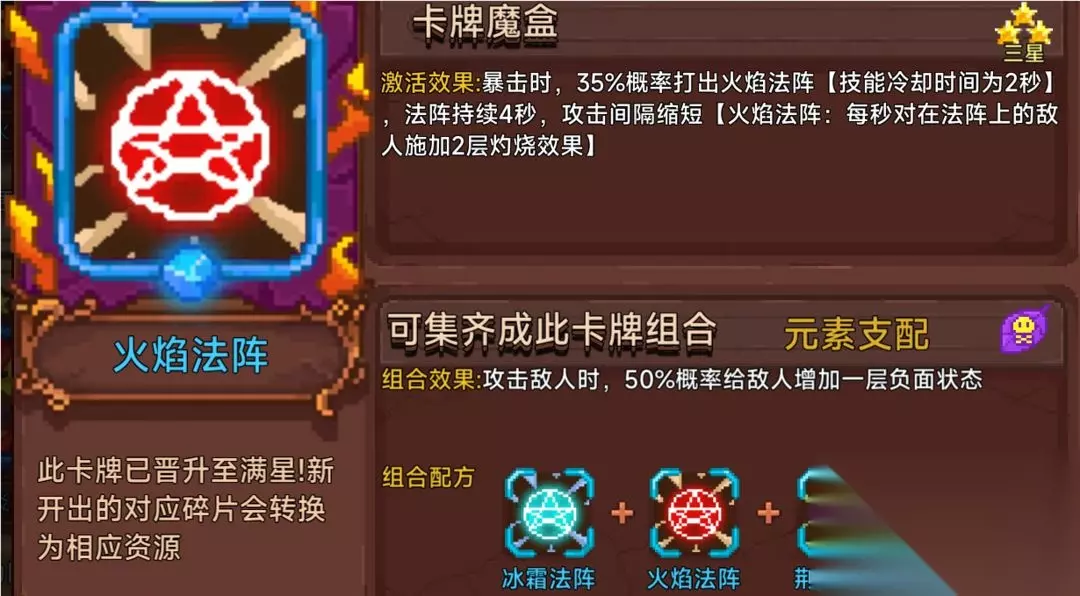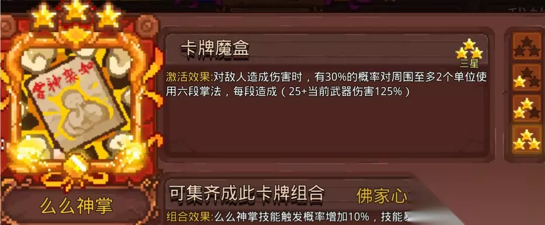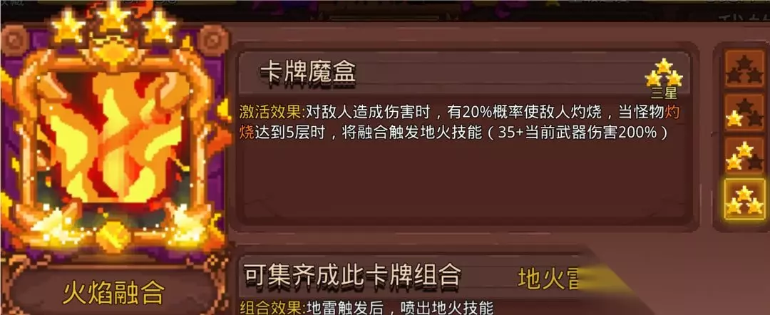 火焰融合能提高灼烧的概率,消耗5层灼烧触发地火造成很高的武器百分比伤害。没有CD。灼烧最高叠15层,但是基本灼烧一到5层就变成地火了,点了火焰融合后灼烧的层数就不能叠多层了。每层灼烧叠上的时候都会先造成一次伤害,常被轻视的卡。 3.么么神掌