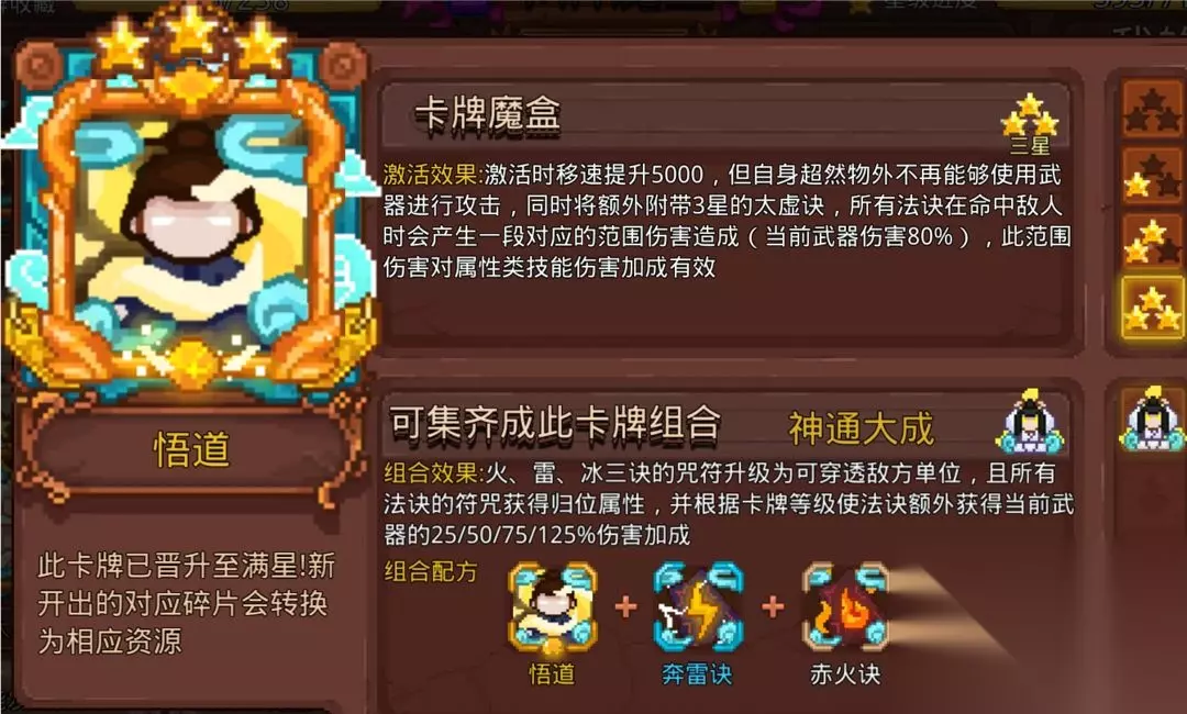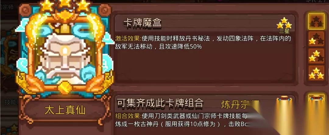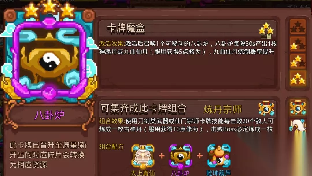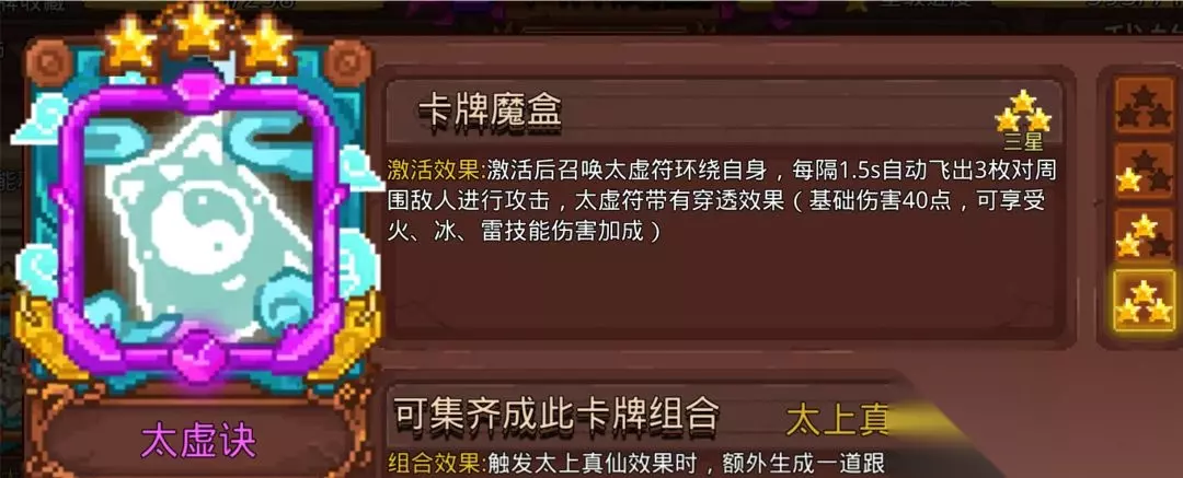 太虚决可以和悟道自带的太虚符一起生效,不用担心带了没效果,虽然自身不在符的组合效果内,但是能吃到悟道和组合效果,很多人因为位置紧张选择不带,太虚决还是挺好用的,可作为补充卡。 7.炼丹