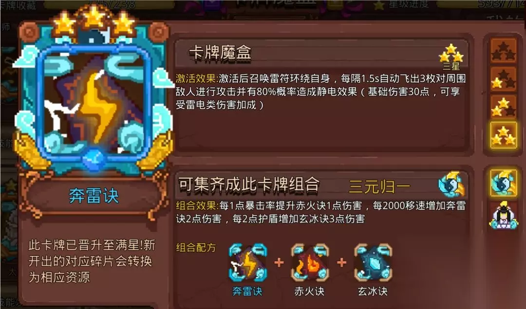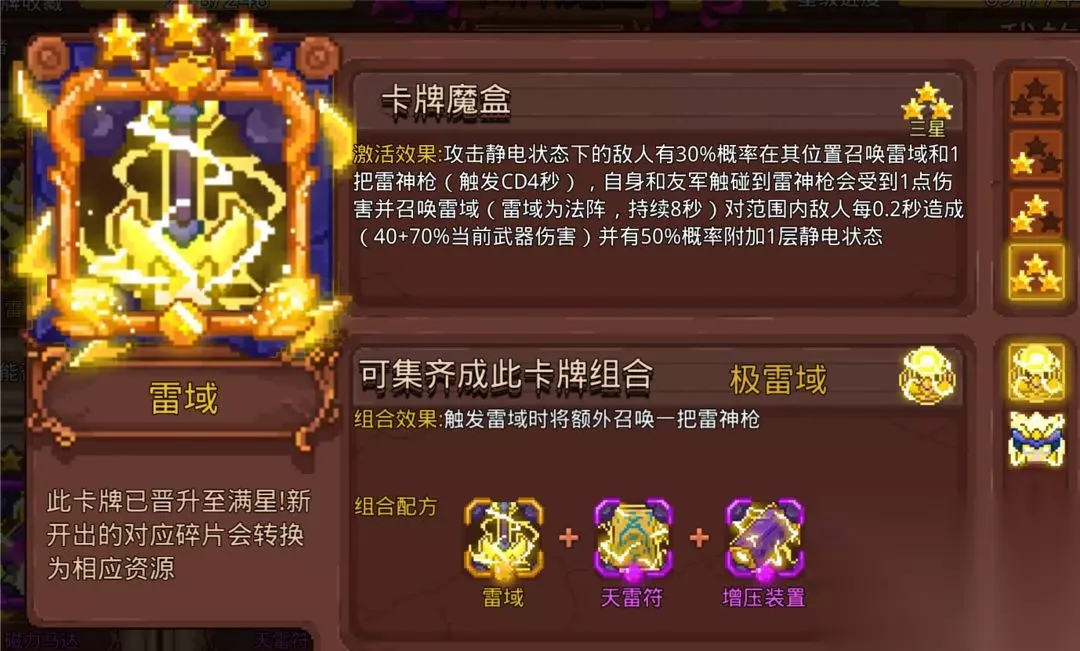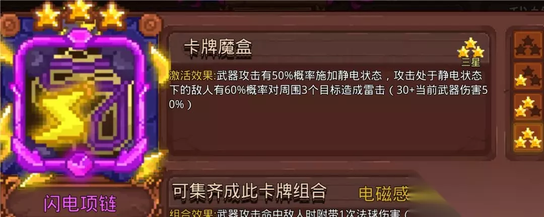 我个人比较喜欢的卡,符攻击不是武器攻击并不能触发它的静电概率,攻击特效的前提是需要敌人是静电状态才行,巧了雷符带静电效果。闪电项链高频率,还是群攻,还能群体上静电。其实更适合高攻速的黑武毒使用,守水晶关卡搭配黑洞简直如割草避免翻车。因为是紫卡满星较难,不满星效果不明显,很多人感受不到它的美。 13.桃之夭夭