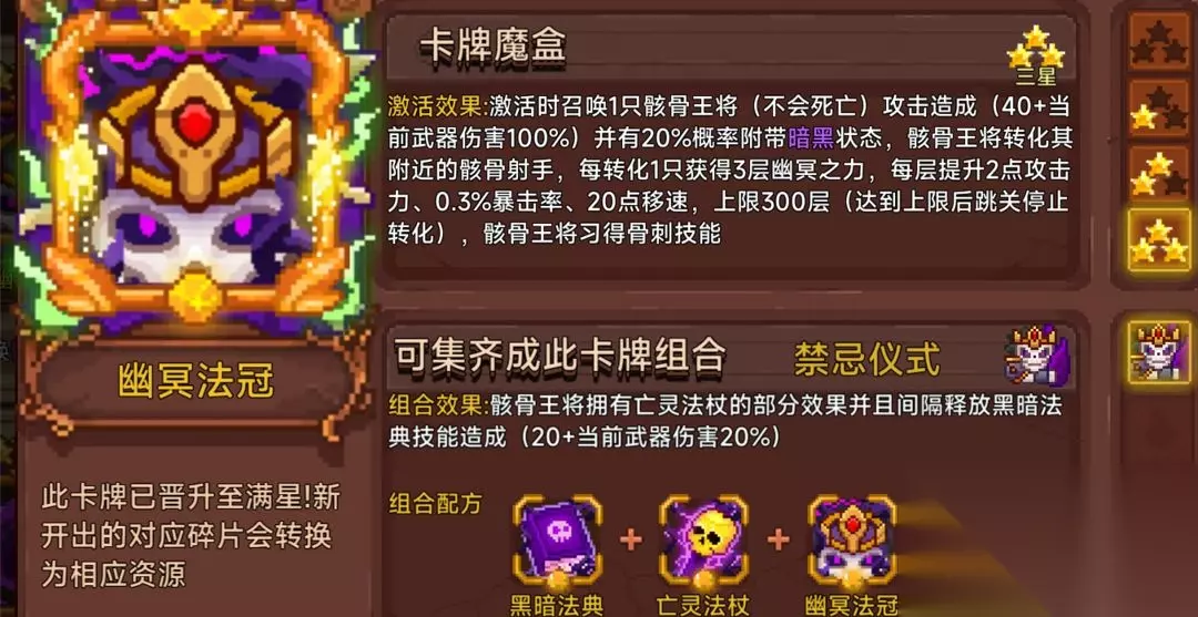 骨王最大的特点是不会死亡,成为了高难度副本深渊的常客。不建议特意点出组合,除非想只靠它输出。搭配亡灵气息即可到关底叠满300层,使用的话一般作为第二张卡在冷水后点出。清怪一流,噩梦3小怪可以一路秒,花点时间也可杀Boss,深渊的话作为不死肉盾是不错的选择。非常推荐萌新获取。只要你能活下去它能解决任何恢复能力不强的敌人。 19.三法阵