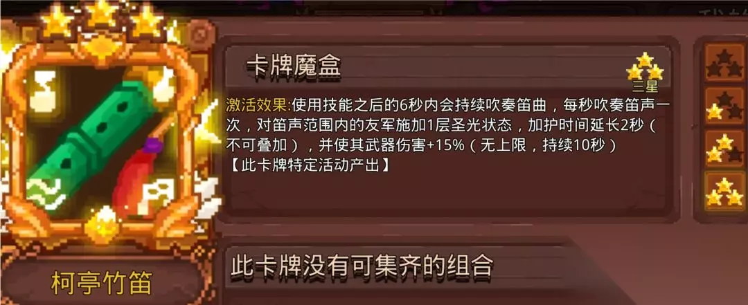 6段高武器百分比伤害,伤害和攻击频率都不错,带点群怪功能,攻击实际是小的范围伤害,高星还能同时打多怪,CD1秒,可作为替补卡。 4.柯亭竹笛