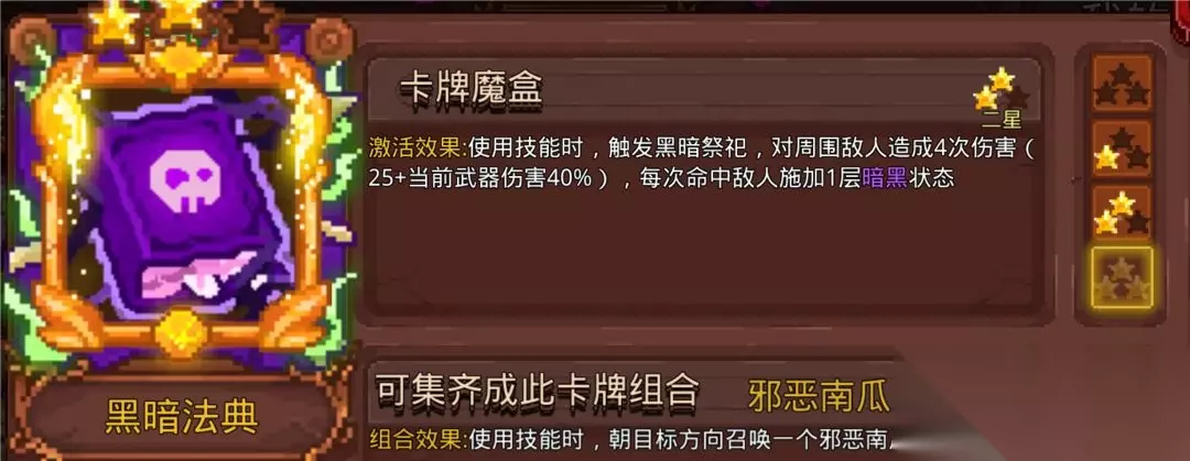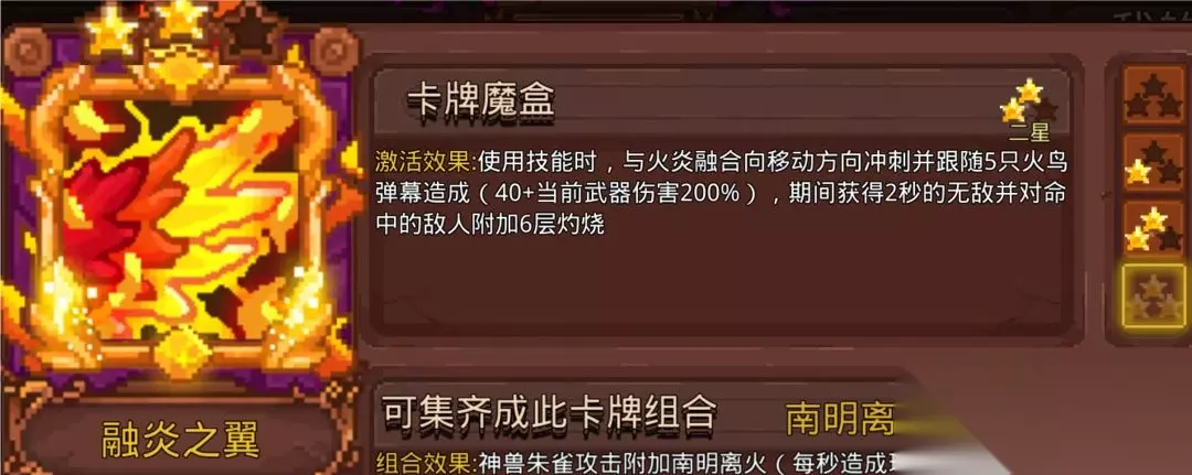 清明节限定卡牌,需要暴击伤害概率触发,触发CD1秒,还附带不稳定的控制,迷晕能控制Boss,属于法阵可以延长阵法存在时间,长线作战的话挺有用。 14.暗黑法典&融炎之翼