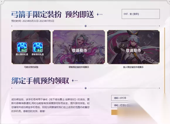 dnf在6月1日进行了周四更新,本次的更新推出了弓箭手预约礼包,玩家需要前往网站进行预约才可以进行领取,本次预约可以获取时装等多种奖励内容。 dnf弓箭手预约礼包领取地址介绍 网页领取地址:【点击前往】 第一种领取方式: 1、点击上面的地址前往dnf的网页,在下面部分就有着预约礼包。