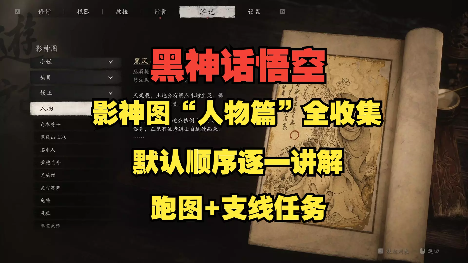 【黑神话悟空】影神图"人物篇"图鉴 全收集/全解锁攻略,相关人物支线任务跑图流程视频。
