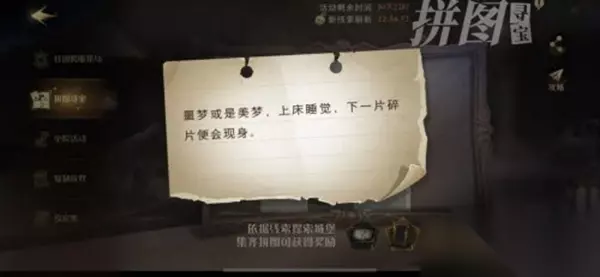 线索:噩梦或是美梦,上床睡觉,下一片碎片便会现身。 位置:【寝室】-【床上】。 路线: 1、这个拼图碎片的位置比较简单,根据线索玩家需要睡觉。 2、因此任务地点是寝室,玩家回到寝室就可以在床上找到碎片了。 哈利波特魔法觉醒10.
