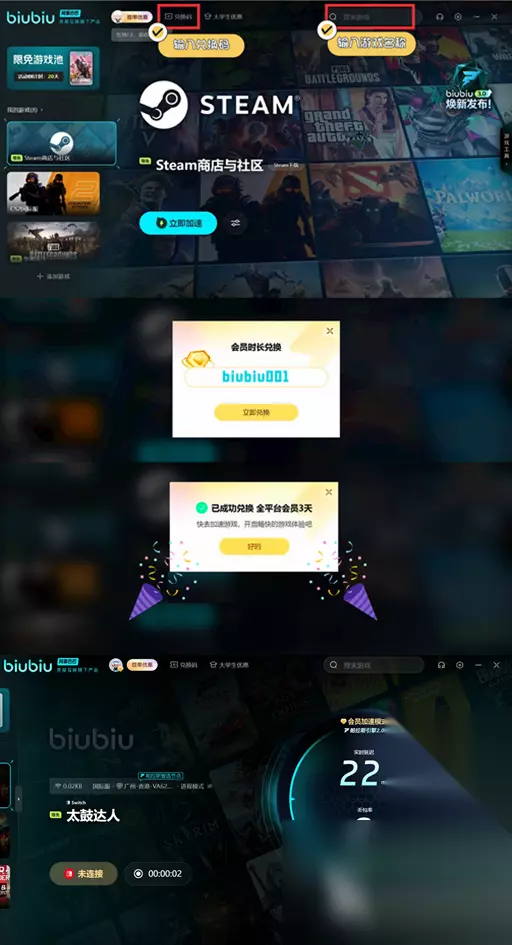 可是对于一款在线游戏来说,网络连接的稳定性往往影响着玩家的游戏体验。在太鼓达人咚咚雷音祭中,网络延迟或卡顿可能会导致玩家无法准确敲击太鼓,从而影响游戏成绩。其实这个问题很好解决,玩家可以使用biubiu加速器进行加速处理,biubiu加速器以其电竞级加速技术和超低延迟表现,能够确保玩家在游戏过程中保持稳定的网络连接,从而畅享无卡顿的游戏体验。 而且现在大家去加入到biubiu的话,注册登录就能享受一个新人24小时免费加速时间的体验礼包。而小编也会分享一些干货,使用这个兑换码【biubiu001】还能额外拿72小时免费加速时间,这样的福利还不来领?总共甚至可以长达96小时的免费时间!