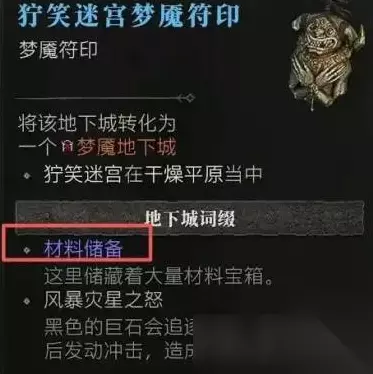 狞笑迷宫梦魔符印 将该地下城转化为一个梦魔地下城,狞笑迷宫在干燥平原当中。 地下城词缀 材料储备:这里储藏着大量材料宝箱。 风暴灾星之怒 黑色的巨石会追逐玩家,靠近目标后发动冲击,造成严重伤害。