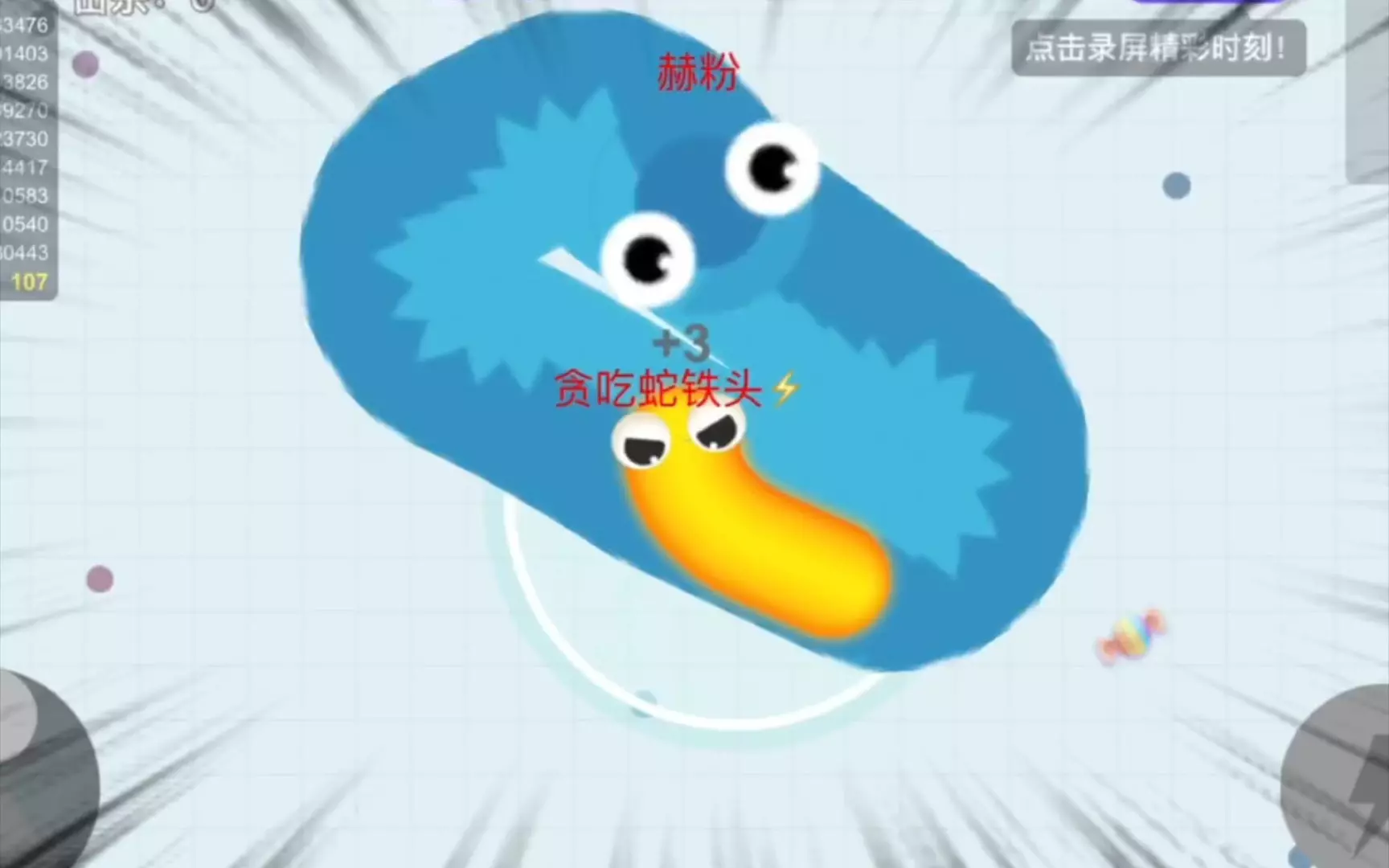 使用平板电脑录制该游戏,本次击杀对手贪吃蛇的数量超过100条。