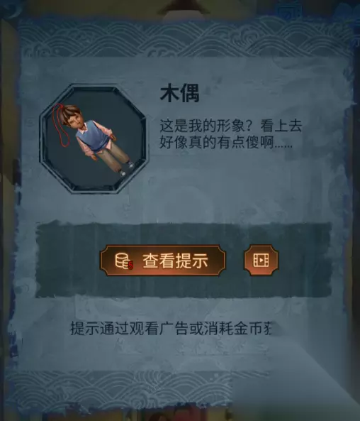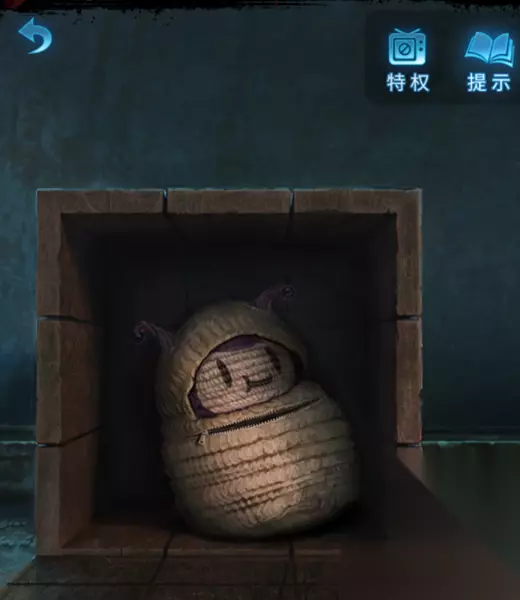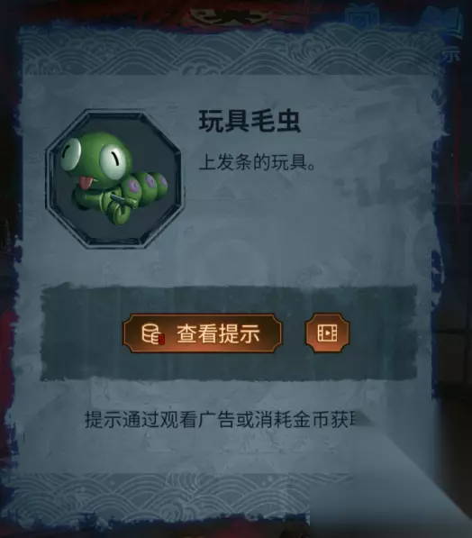 16、视角来到右侧的玩具屋,选择之前的玩偶头装置到图中位置处,完成步骤获得“木牌”。