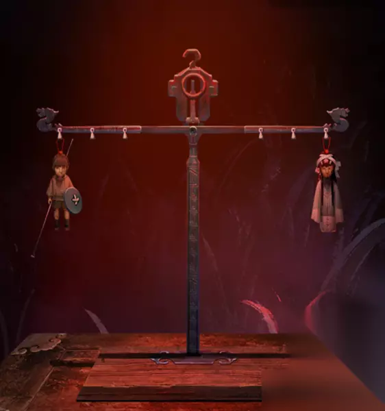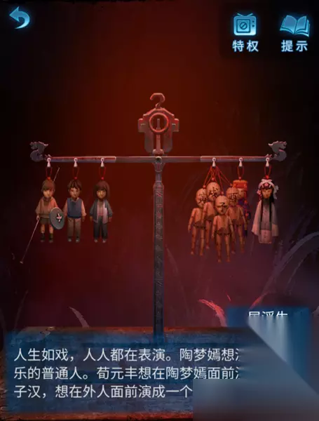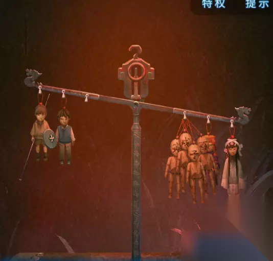 17、离开房间,再次进入到树洞房间,选择桌子放入两个木块,然后回到幻境,将新的木偶放到称竿上,边上的画打开,同时称上再试失衡。