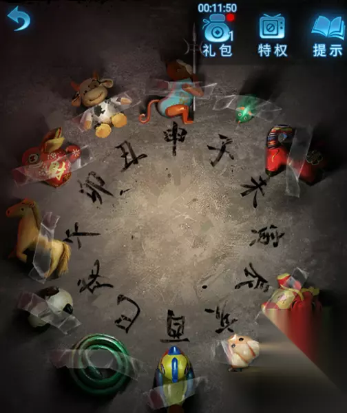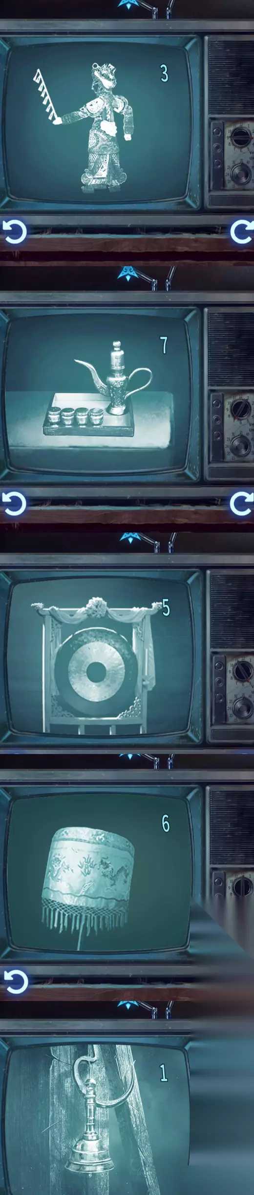 9、根据之前电视机中获得图片的图片和数字以及天上北斗七星来进行点击:①-奘铃;③-皮影;⑤-锣;⑥-伞;⑦-酒壶