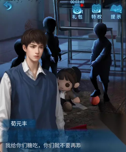 4、接下来离开房间后,点击下方的箭头,进入到教室场景,将糖果人偶附近的孩子们,即可获得“皮球”和“大纽扣”。