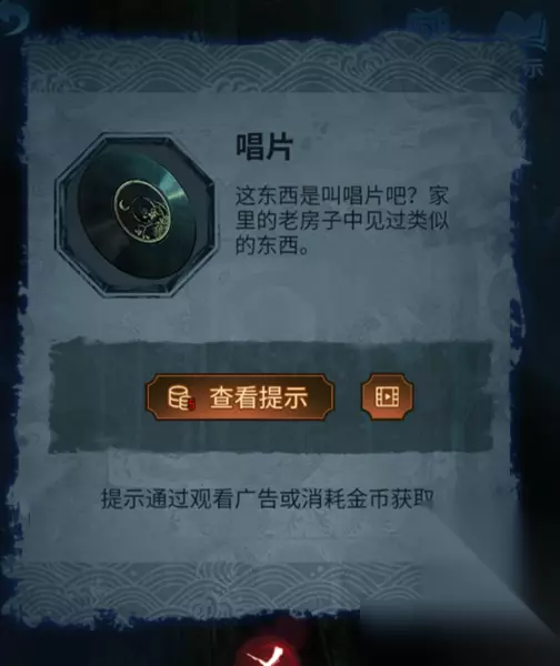 8、返回教室位置,点击左侧黑暗房间,去除房间,在房间中间查看,然后点击左侧靠着的铁棍,获得唱片,将“奘铃”装上。