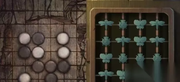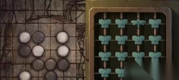14、进入到全新的房间,点击红色的蝴蝶,按照棋盘颜色来将蝴蝶(蜻蜓白色,瓢虫黑色,蝴蝶没有颜色)位置调整。