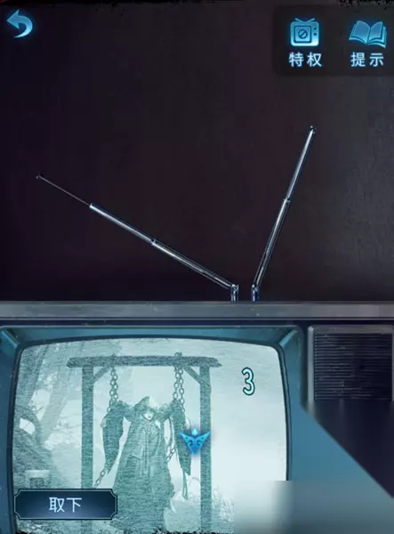 5、然后找到教室里的电视机,将“铁条”放入到天线上,根据日记的线索来调整电视机,步骤如下图。