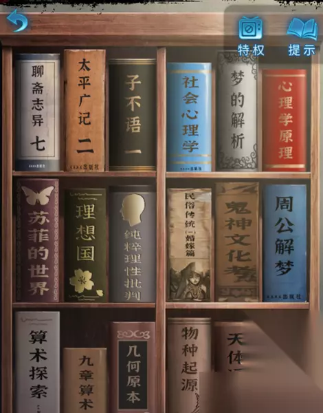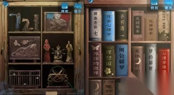 24、返回现代小屋,将书籍放入到房间内的书架上,而里面书籍的摆放摆件根据幻境中来调整,获得“小木块”。