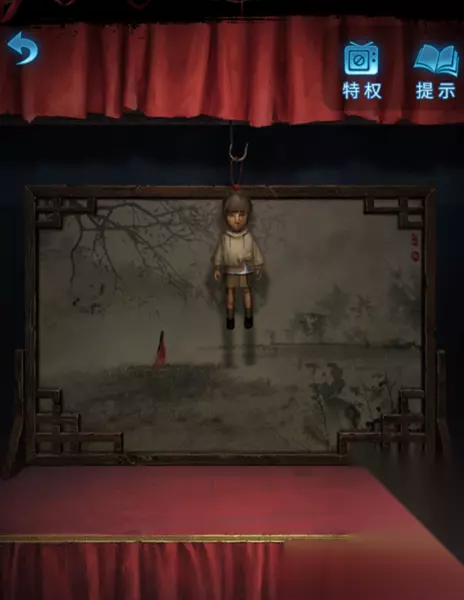 12、转向外面位置,找到戏台,将“玩偶”道具挂在戏台上,幻境破开,在小玩偶的手上放上纽扣和天线。