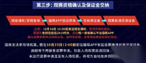 摇号完成后,我们将于10月16日 12:00起发送短信通知获得现场免费观赛资格的召唤师,获得资格的召唤师需要收到短信通知的24小时内(即10月17日12:00前),通过验证的手机号码进入猫眼APP完成资格验证和确认,并在可供选择的座位列表中选择座位并交纳观赛保证金。所交纳的保证金将在决赛入场观赛后按序全额原路退回。 完成登记后,如因故无法来到现场观赛,需在10月23日中午12:00前,前往猫眼APP,在订单内发起退票申请,保证金将会全额原路退回。逾期将不再接受任何退款申请。同时,无法来到现场入场观赛的召唤师,将被视为自动放弃保证金,无法退回的保证金将伴随着后续的公益活动全额捐赠给慈善机构。 四、人脸核身观赛 在人证不符导致无法入场的情况下,保证金将不会退还,会全额捐给慈善机构。现场观赛需全程佩戴口罩。