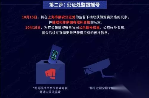 san使用通过验证的QQ号进行实名信息登记,每个通过验证的QQ号最多可登记两个身份信息,只有通过实名验证的个人信息才能录入观赛资格摇号,每个身份信息在系统中仅支持录入一次,所以不可通过多个QQ号或手机号重复填写。 二、公证处监督摇号 为了保证本次整个摇号过程的公正公开,我们将在上海市静安公证处的监督下,使用由拳头游戏独立开发并通过司法鉴定的摇号程序,抽取获得观赛资格的召唤师,并按顺序排列抽取具有候补资格的召唤师。整个摇号流程将现场全程录像并进行官方公示。幸运召唤师及候补资格信息的记录和保存也将由拳头游戏完全独立运作,不经过任何第三方票务平台。 三、免费观赛资格确认