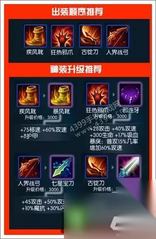 其他玩法, 推荐出隐刀以及融合鞋。保证自己的存活能力。 作为黄忠必出分身这是毫无疑问的。 无论作为输出以及存活能力都是很必要的 毕竟黄忠很脆。 若玩DPS流黄忠。 首出融合鞋。 然后出吸血旗 分身 倍击 晕刀(配合黄忠本身晕眩技能不是一般High) 。 当然 出装不一定要按这种出法。毕竟作为DPS有时对面阵容控制强大的话 肯定要出御魔。 七星 倍击 晕刀 圣剑 雷锤 玄武甲 甚至破甲 都是可以出的装。主要还是要看个人手法以及阵容搭配。 如果玩的是淫荡流- - 出门一双融合鞋子是需要的。然后直接堆专属。 毕竟4级大招 5秒一个的CD实在让人蛋疼。出完专属就应该考虑回蓝以及生存能力的问题了。一般这时候我会出一把隐刀。 一个分身枪。 作为一个淫荡流黄忠 也必须拥有假后期的DPS。这时候倍击就非常必要了。保证自己的爆发力。 这只是小霞我作为梦三玩家的一点点经验吧。 当然每个人都有每个人的玩法,总之 没有最强的英雄。只有最强大的玩家
