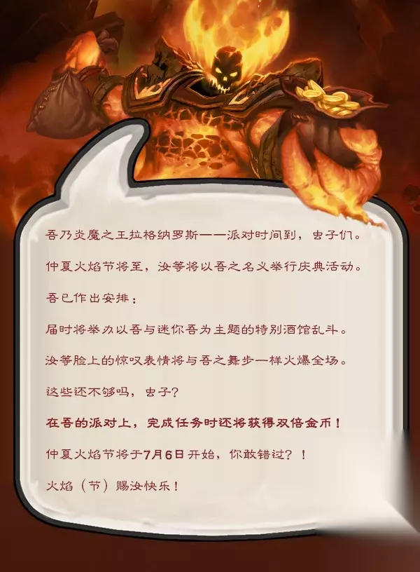 吾乃炎魔之王拉格纳罗斯--派对时间到,虫子们。 仲夏火焰节将至,汝等将以吾之名义举行庆典活动。 吾已作出安排: 届时将举办以吾与迷你吾为主题的特别酒馆乱斗。 汝等脸上的惊叹表情将于吾之舞步一样火爆全场。 这些还不够吗,虫子? 在吾的派对上,完成任务时还将获得双倍金币! 仲夏火焰节将于7月6日开始,你敢错过?! 火焰(节)赐汝快乐! 看了上文233乐园小编带来的炉石传说仲夏火焰节玩法,你是否了解了相关内容信息,知道了呢!更多最新最好玩的手机游戏就来233乐园下载吧! 如转载涉及版权等问题,请作者与我司联系,我司将在第一时间删除或支付稿酬。