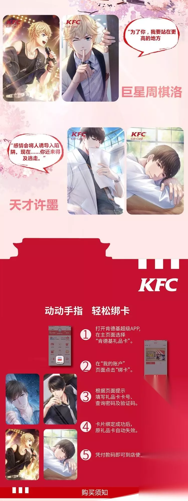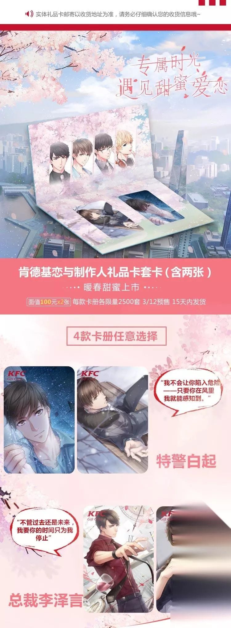 恋与制作人肯德基礼品卡套卡有兑换码吗: 没有兑换码的,就是一张200元储值卡,在肯德基消费用的。 恋与制作人肯德基礼品卡套卡值得买吗: 200元的礼品卡,对于喜欢吃KFC的小伙伴来说还是挺划算的,因为200元的固定金额,想吃什么就从里面扣就行了。 如果不喜欢吃KFC,制作人们可以和别人商量一下,你要卡,别人要账户余额。具体的商量分摊即可。