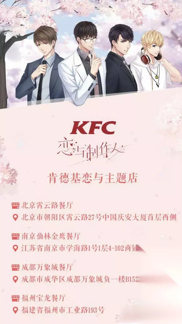 恋与制作人KFC兑换码最多可兑换几次: 一个帐号可以兑5个不同闪卡上面的码,这个码里面只有1-5(其实大部分就是1-2)张的星河券。 然后KFC官网上面有个接电话的也有兑换码,那个码就一个帐号只能兑一次,里面是金币+体力+告白心愿。 以下这些城市门店可以看到恋与制作人装饰: