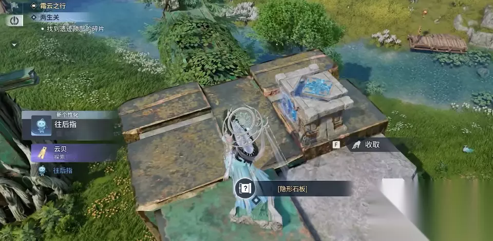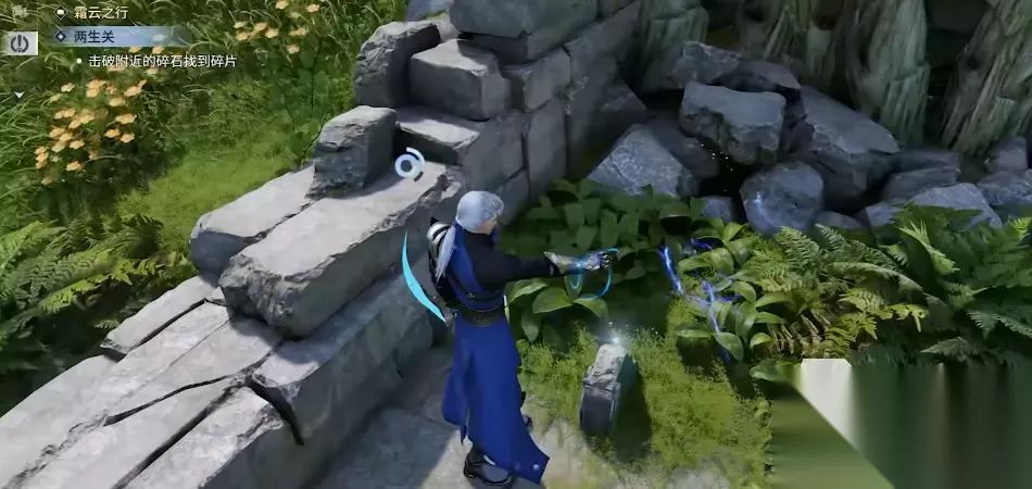 根据对话内容需要玩家找到2个关键道具。第一个道具的位置就在刚刚清小怪的地方附近,击碎一个大石堆后就能领取到。第二个石块道具的领取方式就比较复杂了。先要来到巨石阵正前方的机关处,触发机关【踏霄阵】,机关触发后石块开始位移升降,这个时候玩家需要踏上石板并随着它的位移来前进,直到能到达目标位置。玩家如果熟悉滑索操作的话,能利用滑索快一点到达位置。