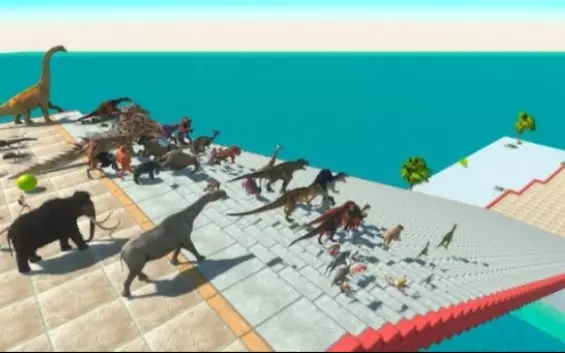 这是《动物起义战争模拟器》的模组玩法视频,呈现了模组英雄、恐龙等角色参与逃离岩浆的挑战,部分角色在挑战中落入岩浆失败,展示了趣味的闯关玩法。