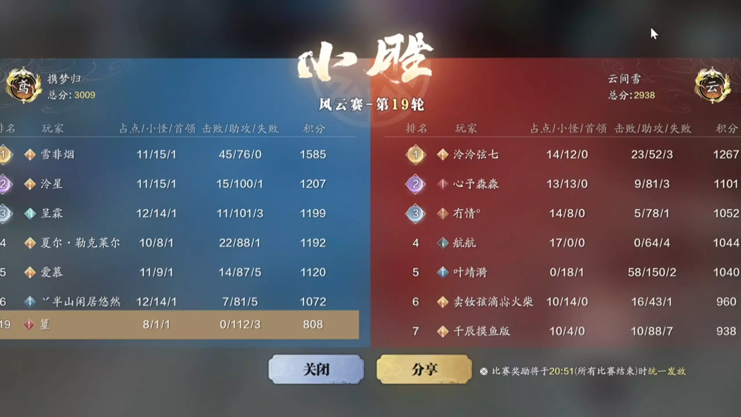 这是一场武侠手游的对战,云间雪与携梦归两大阵营展开对决,从战前准备到实战交锋,双方成员在战场中释放技能激烈对抗,战况胶着。