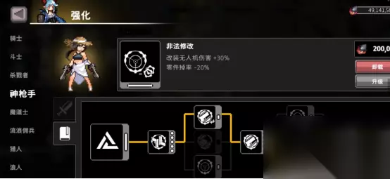 加点也是较为简单的,其中主加点可以选择比较常见的愤怒基本技能,攻击力能够增加50%,攻击速度增加20%,暴击率增加10%。附加点可选择贪婪,运气增加16%,初始黄金增加400.在天赋方面,主要输出是无人机发出的武器技能,因此伤害点满减掉率是并不需要过多担心的。此时改装无人机,也就是我们利用零件合成打造的武器,可搭载到神枪手腰上的无人机。