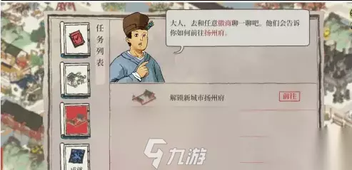 二、徽商交易: 点击任意一家徽商的议事堂,切换到“经商”页面。 选择需要交易的物资及数量,然后点击“出发”进行交易。 完成一次徽商交易后,点击“奖励”与徽商对话,即可解锁扬州府。