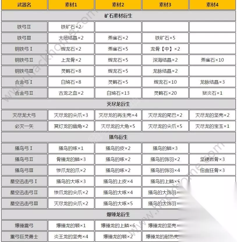 铁弓Ⅰ(可以直接生产) └铁弓Ⅱ ├铁弓Ⅲ │└钢铁弓Ⅰ │└钢铁弓Ⅱ │└钢铁弓Ⅲ │└合金弓Ⅰ │├合金弓Ⅱ │└灭尽龙大弓 │└必灭一矢 ├搔鸟弓Ⅰ │├搔鸟弓Ⅱ ││└搔鸟弓Ⅲ ││└星空迅击弓Ⅰ(可以直接生产) ││├星空迅击弓Ⅱ │││└星空迅击弓Ⅲ ││└爆锤震弓 ││└重弓巨灵勇士 │└公主弓矢Ⅰ │├公主弓矢Ⅱ ││└公主弓矢Ⅲ │└火龙强弓Ⅰ │└火龙强弓Ⅱ │└火龙强弓Ⅲ └水流弓Ⅰ └水流弓Ⅱ ├水流弓Ⅲ │└激流射手Ⅰ │└激流射手Ⅱ │└激流射手Ⅲ └优雅长弓Ⅰ └优雅长弓Ⅱ └银蕨 └冰凌银蕨 猎弓Ⅰ(可以直接生产) └猎弓Ⅱ ├猎弓Ⅲ │└能量猎弓Ⅰ │├能量猎弓Ⅱ ││└能量猎弓Ⅲ ││└勇气猎弓Ⅰ ││├勇气猎弓Ⅱ ││└尸套龙弓Ⅰ ││└尸套龙弓Ⅱ │└爆槌大弓Ⅰ │└爆槌大弓Ⅱ │└爆槌角弓 │└疾风角弓 │└角王弓疾风 ├花朵弓Ⅰ │├花朵弓Ⅱ ││└花朵弓Ⅲ ││└曼陀罗弓Ⅰ ││└曼陀罗弓Ⅱ ││└曼陀罗弓Ⅲ │└火焰弓Ⅰ │└火焰弓Ⅱ │└蛮颚龙射手Ⅰ │└蛮颚龙射手Ⅱ │└蛮颚龙射手Ⅲ └脉冲弓Ⅰ └脉冲弓Ⅱ └脉冲弓Ⅲ └飞雷弓射手大蛇 └飞雷弓【羽羽矢】 龙骨弓Ⅰ(可以直接生产) └龙骨弓Ⅱ └龙骨弓Ⅲ 黑钢弓Ⅰ(可以直接生产) └黑钢弓Ⅱ ├钢冰马弓 │└钢龙强弓 └冥灯龙大弓 十字猎弓 └巨型猎弓