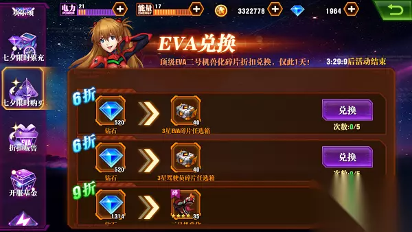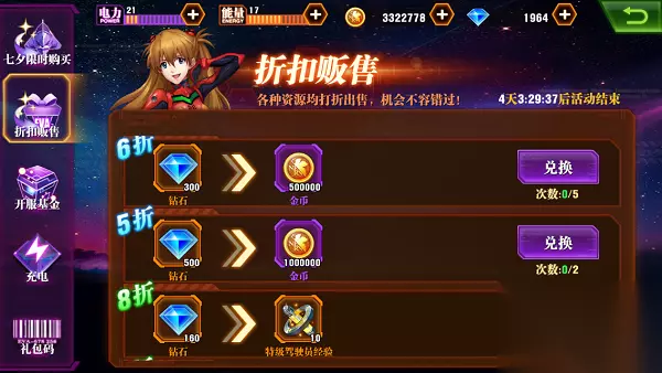 3、折扣贩售 折扣贩售中各种资源打折出售,前期金币来源充足,所以小编不推荐用钻石买金币,每天点金点几次就够用了。而购买稀缺资源却是很划算的,尤其是3星驾驶员和EVA碎片宝箱。