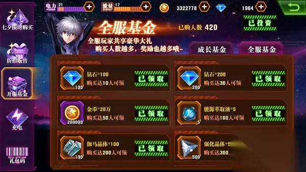 标签: 钻石 作为日漫神作《新世纪福音战士》改编的EVA 3D动作手游《新世纪福音战士OL》将于近期迎来全平台首发,所谓磨刀不误砍柴工,游戏中,钻石来之不易,那么应该怎么花呢。今天小编就来教教大家怎么花钻石,好钢用在刀刃上,要把钻石花在合理的地方,避免不必要的浪费。 1、开服基金 开服基金是小编认为最划算的,开服必买,只需花少量的钻石就能获得总计10000的钻石。最关键的是,全服玩家共享豪华大礼,购买人数越多,奖励越多。