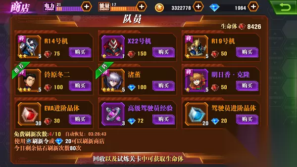 6、队员商店 队员商店中可以刷新出驾驶员和EVA碎片,平民玩家可以用生命体来购买自己想要的碎片。如果玩家有多余的钻石,可以在队员商店购买一些自己想刷的橙色碎片,此时钻石推荐花在3星及3星以上碎片上,不然还是不要浪费钻石。