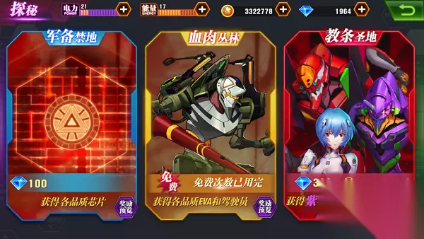 2、教条圣地 要想获得橙色EVA和驾驶员,很重要的途径之一就是教条圣地十连抽。前期钻石来得快,玩家可以多几次十连抽,每次十连抽必得橙色EVA或驾驶员,几率还是很高的,缺少橙色EVA或驾驶员来撑阵容的玩家,通过几次十连抽很快就能把第一阵容给凑齐了。后期建议平民玩家将钻石用来商店购买碎片更好。土豪大R请随意。