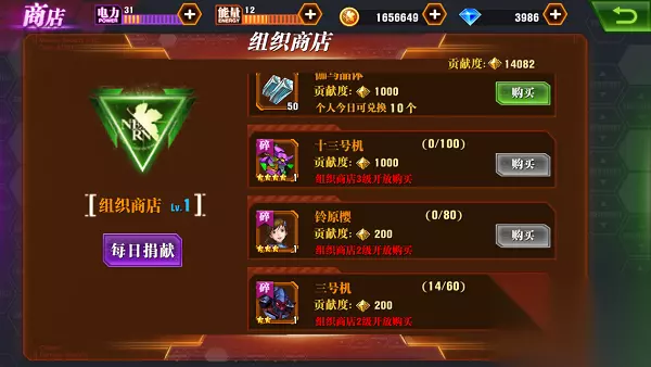 4、组织捐献 大家别忘了每天的组织捐献,推荐玩家进行中级以上捐献,能获得大量贡献度去组织商店里兑换资源。可以加个高等级组织,组织商店里的进阶晶体、同步药剂、伽马晶体都是必买的,而且组织商店还是十三号机和三号机碎片产出的重要途径。